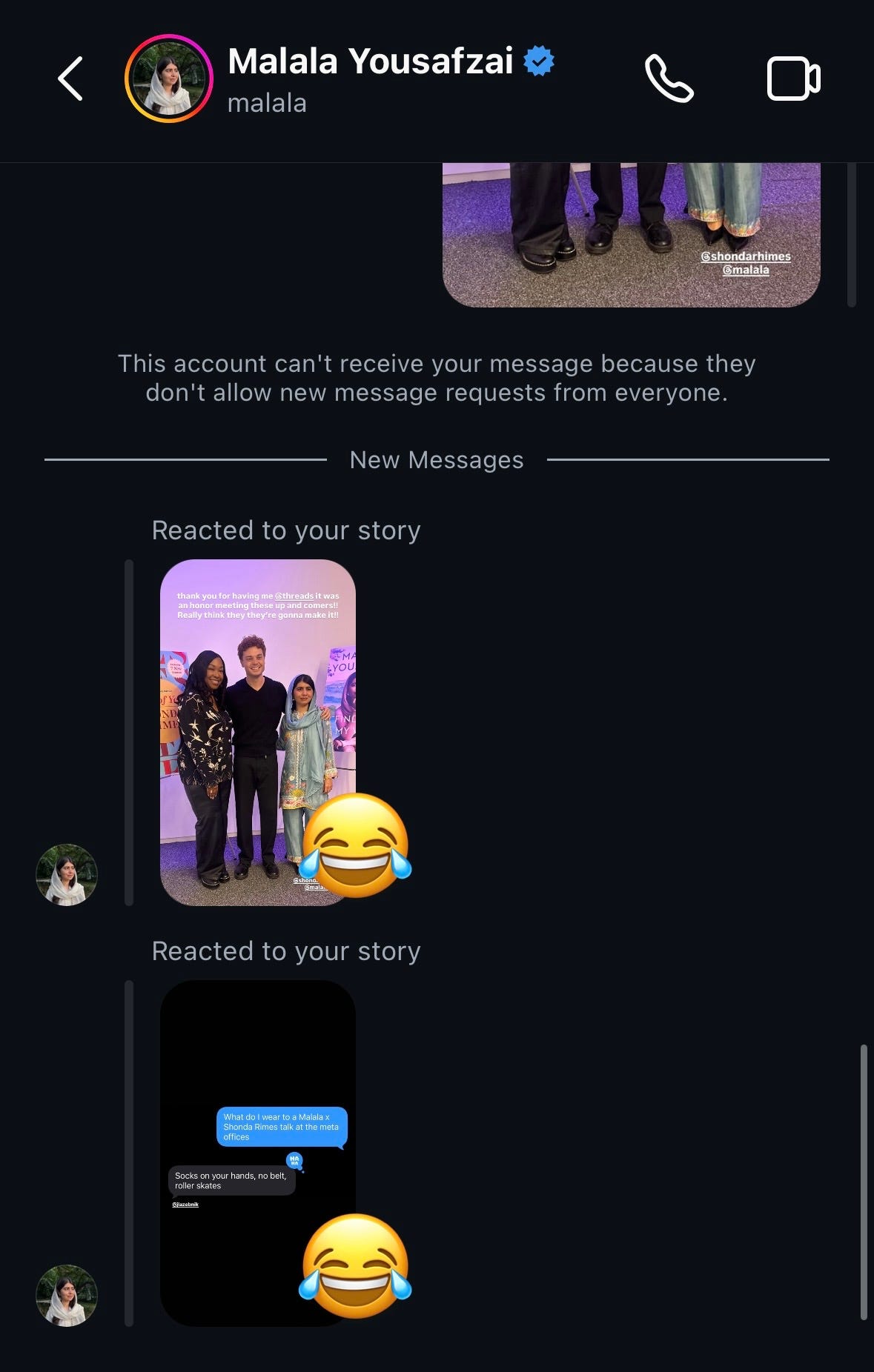 If you’re reading this, and you have the power to invite me to events of any kind, please do. This week, I attended a conversation between Shonda Rhimes and Malala Yousafzai (thank you Threads!!), and I’ll be the first to say it… those ladies really got something to say!! I posted a cheeky Instagram story to that effect, and was bewildered to receive not one but TWO “😂” reactions from Malala herself an hour later. How many of you can claim to have made a Nobel Peace Prize winner ijbol this week? That’s what I thought.